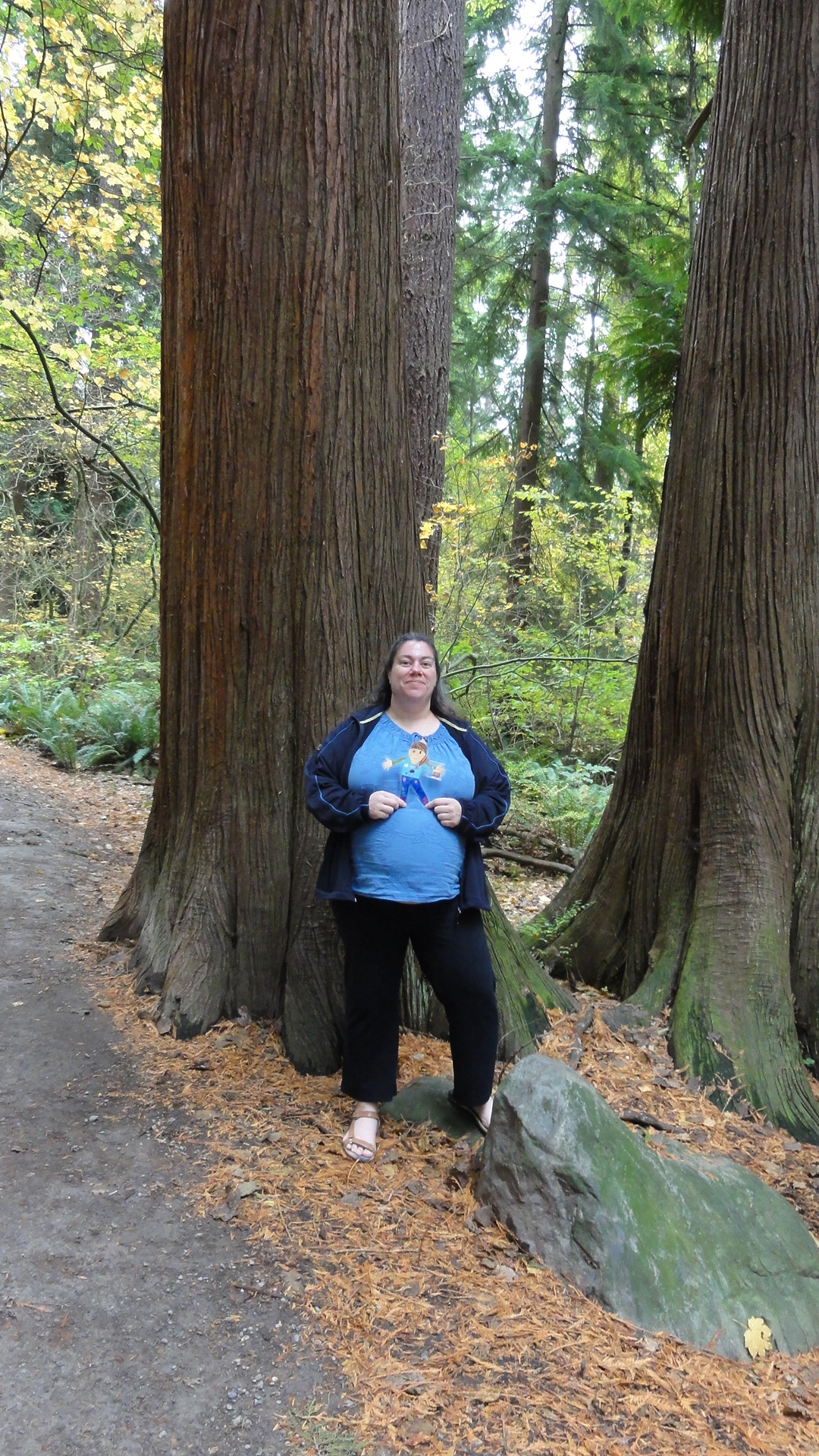 Once we got her, we met my sister Tamar (who is due to have that baby today and can go right on ahead and have it, now that I’ve arrived). Tamar and I took flat Katherine to Central Park in Burnaby, where we saw amazing cedar trees: