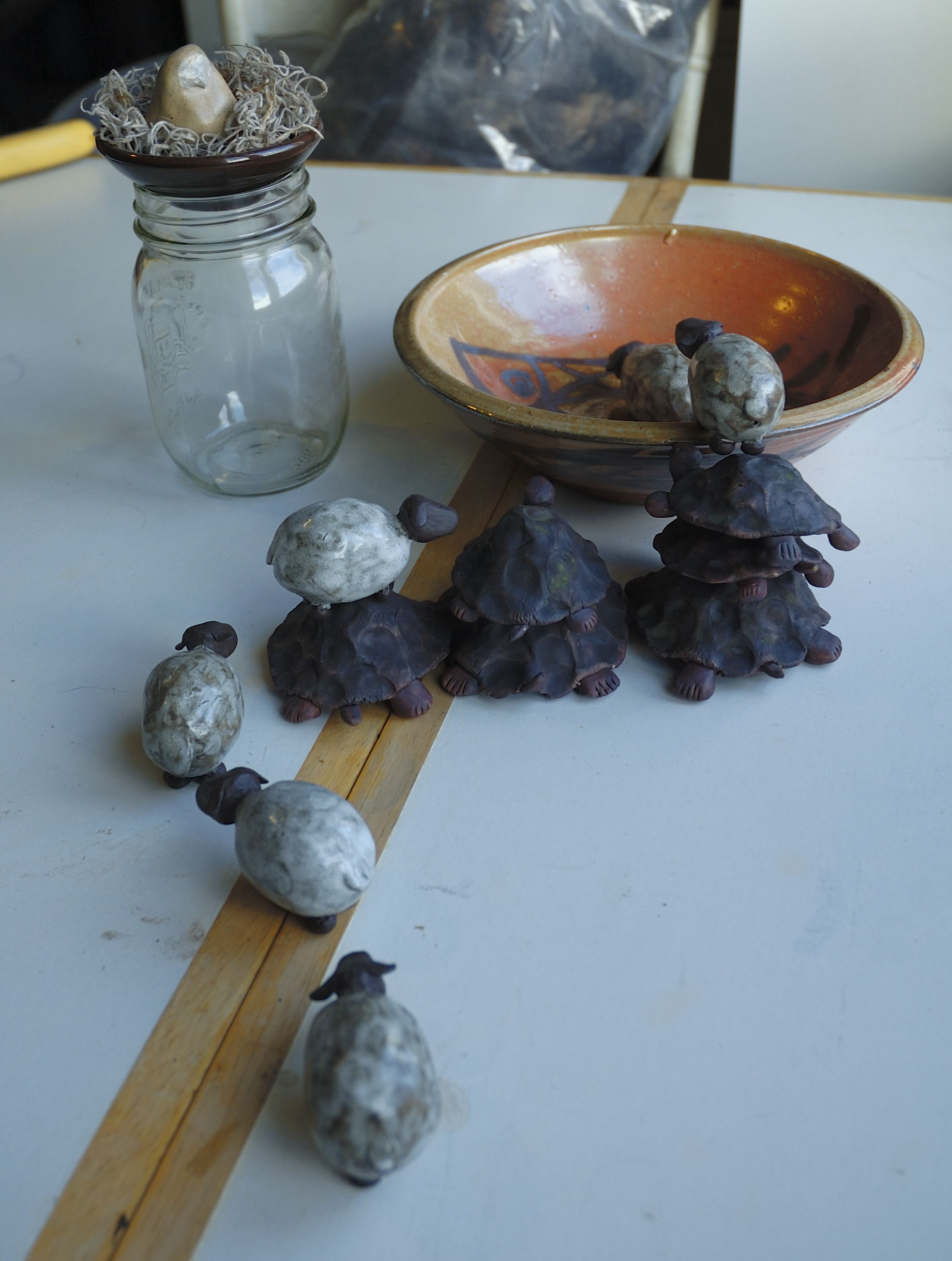 I was a little worried when I saw their reaction to other pottery creatures, though. Here they confront an owl, made by Christina Rees. Luckily owls can fly.