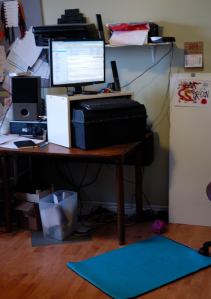 Because I have laminate floor and like to work barefoot (I’m at home, so it’s socially acceptable), I folded a yoga mat in two and placed it in my standing range. It’s far easier on the feet. The overall positioning of the station allows me to constantly shift my stance, alter which leg takes the weight, and focus on tightening my core muscles for better posture. Basically, it’s forcing me to get off my arse, spend focused time at the computer (instead of dipsy-doodling across the ‘Net) and maintain correct posture. It’s also much easier to switch tasks (i.e. from computer use to changing over the laundry) when you’re already on your feet. And a quick email check stays a quick email check and doesn’t become a half an hour gone to I-don’t-know-where.
