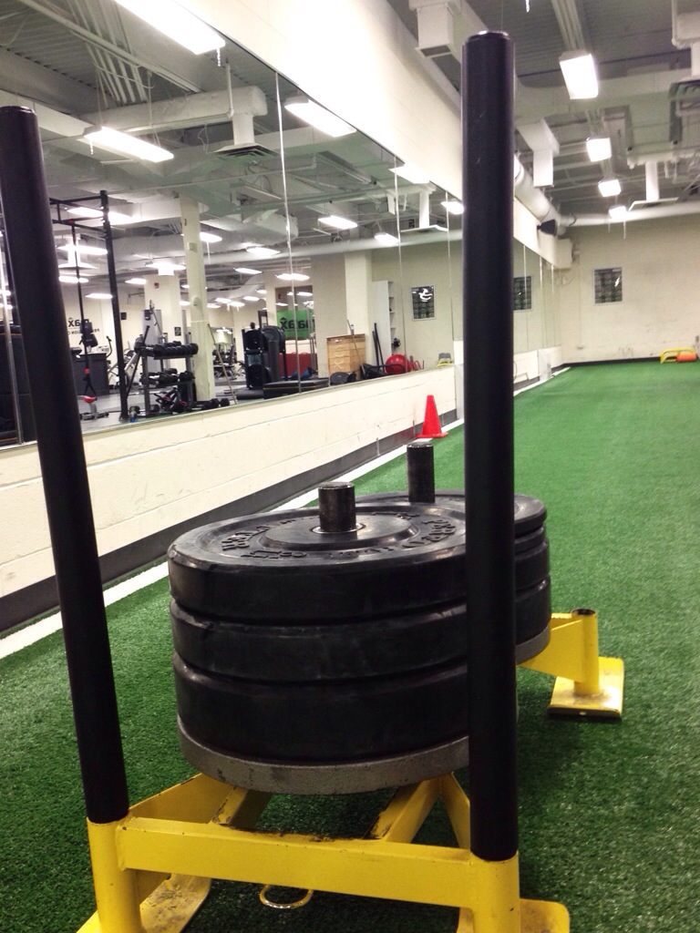 Got down to the gym at around 9:10, cranked out intervals on the Concept2 rowing machine. Legs loosened up. All was well. Had the place basically to myself. It was fun. Finished up with rowing, legs still had energy, so I wandered over to the turf section of the gym, to see if the sled wanted to go for a spin.